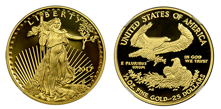 On the back you will also find the weight and face value of the coin. The American Gold Eagles are available in a 1-ounce coin with a face value of $50, a 1/2-ounce coin with a face value of $25 , a 1/4-ounce coin with a face value of $10, and a 1/10-ounce Eagle with a face value of $5.